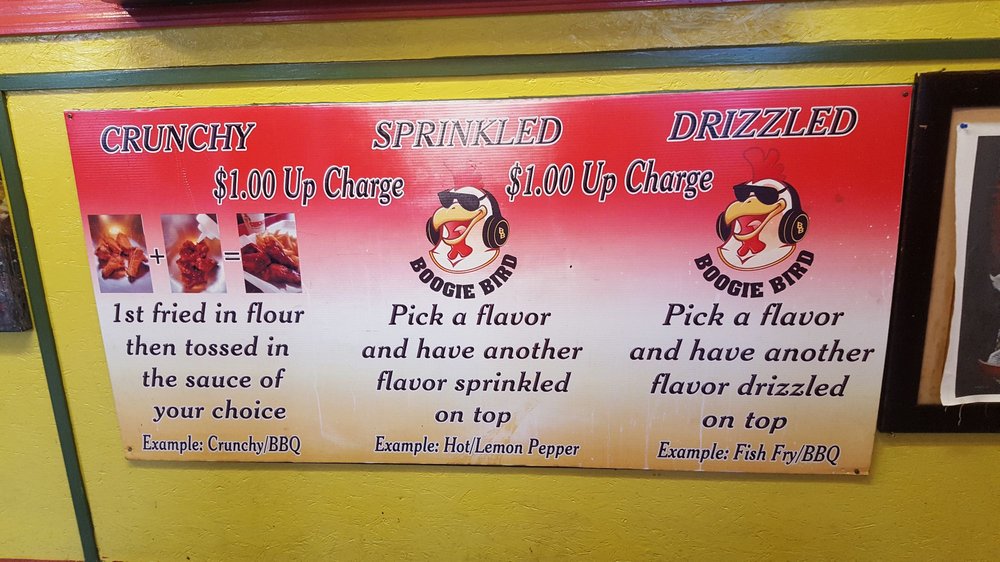 Please specify in special instructions if you choose to add an additional flavor whether you would like it sprinkled or drizzled on top of another flavor.or how u would like the flavors split..for example 20 piece 10 hot 10 cajun ranch..or 20 piece 10 cajun ranch sprinkled lemon pepper and 10 chipotle drizzled with boogie bird ..please be specific